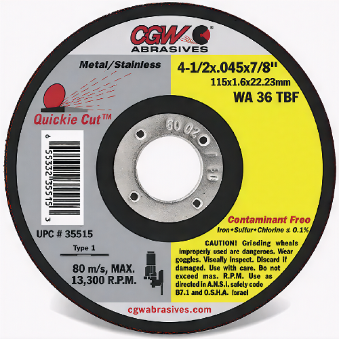 CGW Cut-Off Wheel, Type 1 Wheel, 4-1/2 in Diameter, 0.045 in Thickness, 7/8 in Arbor, 36 Grit, Aluminum Oxide Abrasive, 13300 rpm, T Hardness, Applicable Materials: Aluminum, Stainless Steel, White