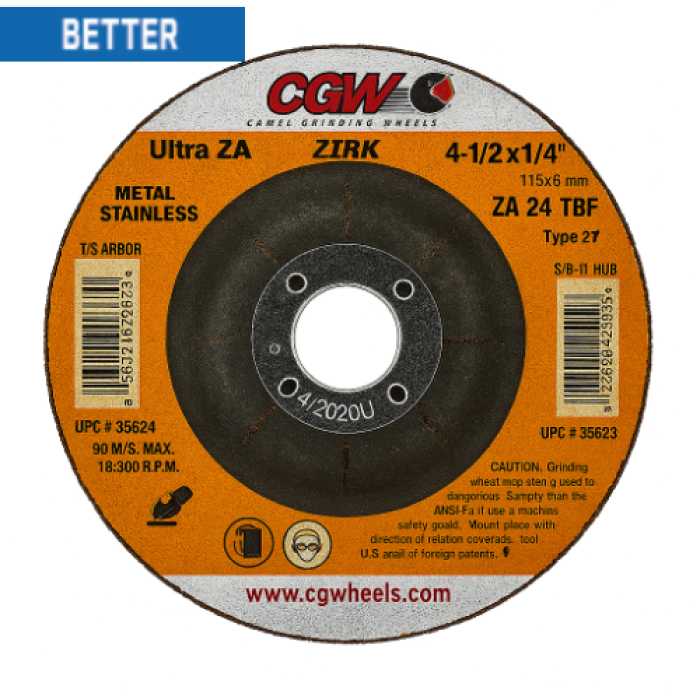 CGW Depressed Center Grinding Wheel, Type 27 Wheel, 4-1/2 in Diameter, ZA24T Grit, Zirconia Alumina Abrasive, Cut Materials: Iron, Stainless Steel, Steel