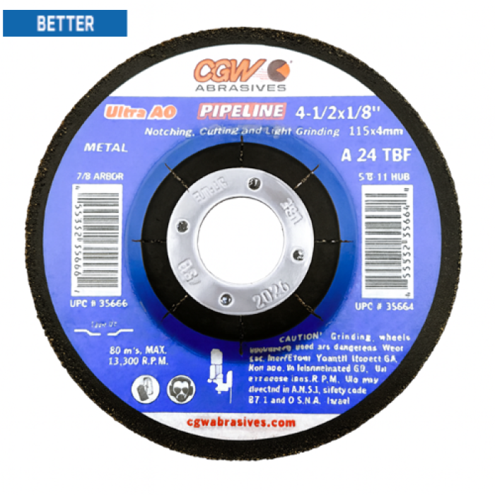 CGW Depressed Center Grinding Wheel, Type 27, Ultra Wheel, 4-1/2 in Diameter, 1/8 in Thickness, 7/8 in Arbor, A24T Grit, Aluminum Oxide Abrasive, 13300 rpm Maximum Speed, T-Grade Bond, Cut Materials: Steel