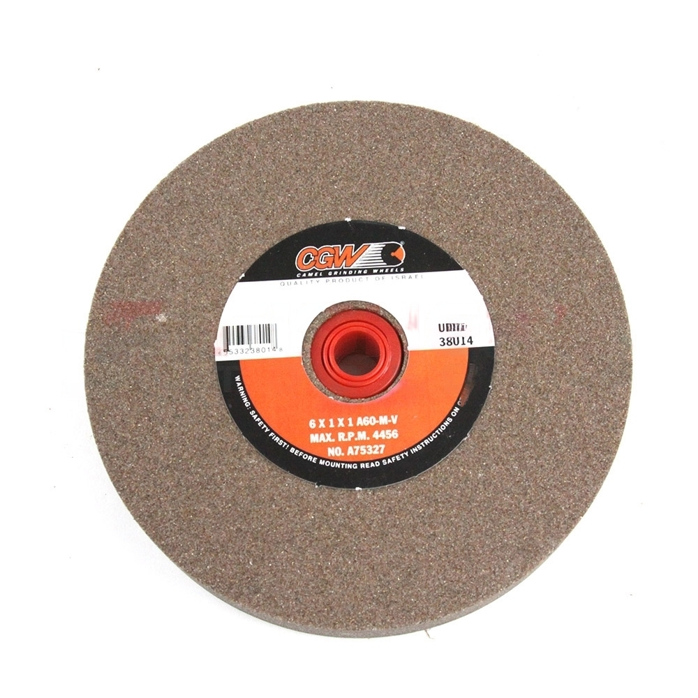 CGW Bench and Pedestal Grinding Wheel, Type 1 Wheel, 6 in Diameter, 1 in Thickness, 1 in Arbor, 60 Grit, Medium Grit Grade, Aluminum Oxide Abrasive, 4456 rpm Maximum Speed, Vitrified Bond, M Hardness, Applicable Materials: Ferrous Alloy, High Tensile Materials, Wood, Brown