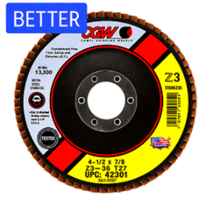 CGW Abrasive Flap Disc, 4-1/2 in Diameter, 7/8 in Center Hole, Type 27 Disc, 36 Grit, Medium Grit Grade, Zirconia Alumina Abrasive, Poly Cotton Backing, 13300 rpm Maximum Speed, Applicable Materials: Ferrous, Heat Treated Steel, High Temperature Alloy, High Tensile Alloy, High Tensile Non-Ferrous Metal, Non-Ferrous Metal, Stainless Steel, Performance Tier: Better