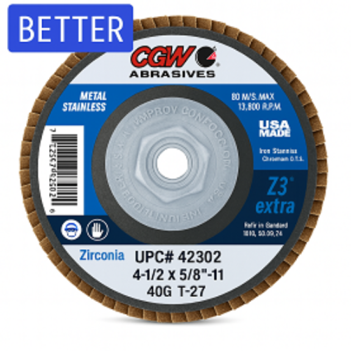 CGW Abrasive Flap Disc, 4-1/2 in Diameter, 7/8 in Center Hole, Type 27 Disc, 40 Grit, Medium Grit Grade, Zirconia Alumina Abrasive, Poly Cotton Backing, 13300 rpm Maximum Speed, Applicable Materials: Ferrous, Heat Treated Steel, High Temperature Alloy, High Tensile Alloy, High Tensile Non-Ferrous Metal, Non-Ferrous Metal, Stainless Steel, Performance Tier: Better