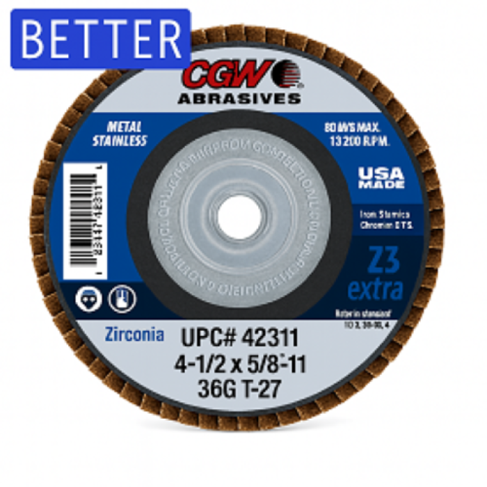 CGW Abrasive Flap Disc, 4-1/2 in Diameter, 5/8-11 Center Hole, Type 27 Disc, 36 Grit, Medium Grit Grade, Zirconia Alumina Abrasive, Poly Cotton Backing, 13300 rpm Maximum Speed, Applicable Materials: Carbon, Stainless Steel, Performance Tier: Better