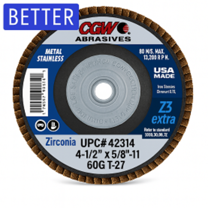 CGW Abrasive Flap Disc, 4-1/2 in Diameter, 5/8-11 Center Hole, Type 27 Disc, 60 Grit, Medium Grit Grade, Zirconia Alumina Abrasive, Poly Cotton Backing, 13300 rpm Maximum Speed, Applicable Materials: Ferrous, Heat Treated Steel, High Temperature Alloy, High Tensile Alloy, High Tensile Non-Ferrous Metal, Non-Ferrous Metal, Stainless Steel, Performance Tier: Better