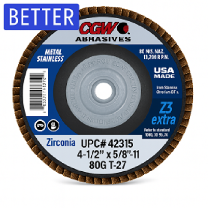 CGW Abrasive Flap Disc, 4-1/2 in Diameter, 5/8-11 Center Hole, Type 27 Disc, 80 Grit, Fine Grit Grade, Zirconia Alumina Abrasive, Poly Cotton Backing, 13300 rpm Maximum Speed, Applicable Materials: Ferrous, Heat Treated Steel, High Temperature Alloy, High Tensile Alloy, High Tensile Non-Ferrous Metal, Non-Ferrous Metal, Stainless Steel, Performance Tier: Better