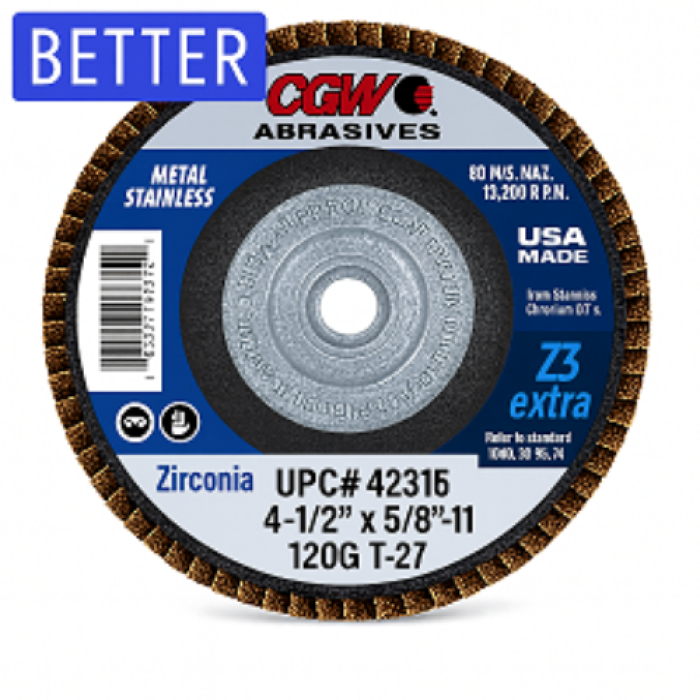 CGW Abrasive Flap Disc, 4-1/2 in Diameter, 5/8-11 Center Hole, Type 27 Disc, 120 Grit, Fine Grit Grade, Zirconia Alumina Abrasive, Poly Cotton Backing, 13300 rpm Maximum Speed, Applicable Materials: Ferrous, Heat Treated Steel, High Temperature Alloy, High Tensile Alloy, High Tensile Non-Ferrous Metal, Non-Ferrous Metal, Stainless Steel, Performance Tier: Better