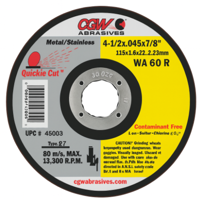 CGW Cut-Off Wheel, Type 27 Wheel, 4-1/2 in Diameter, 0.045 in Thickness, 7/8 in Arbor, 60 Grit, Aluminum Oxide Abrasive, 13300 rpm, R Hardness, Applicable Materials: Stainless Steel, White