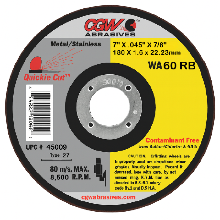CGW Contaminant-Free Cut-Off Wheel, Type 27 Wheel, 7 in Diameter, 0.045 in Thickness, 7/8 in Arbor, WA60R Grit, Aluminum Oxide Abrasive, 8500 rpm, Applicable Materials: Stainless Steel