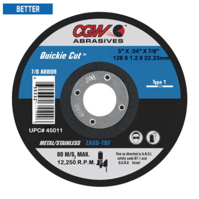 CGW Quickie Cutâ„¢ Cut-Off Wheel, Type 1 Wheel, 5 in Diameter, 0.04 in Thickness, 7/8 in Arbor, 60 Grit, Aluminum Oxide/Zirconia Abrasive, 12250 rpm, T Hardness, Applicable Materials: Stainless Steel, Steel